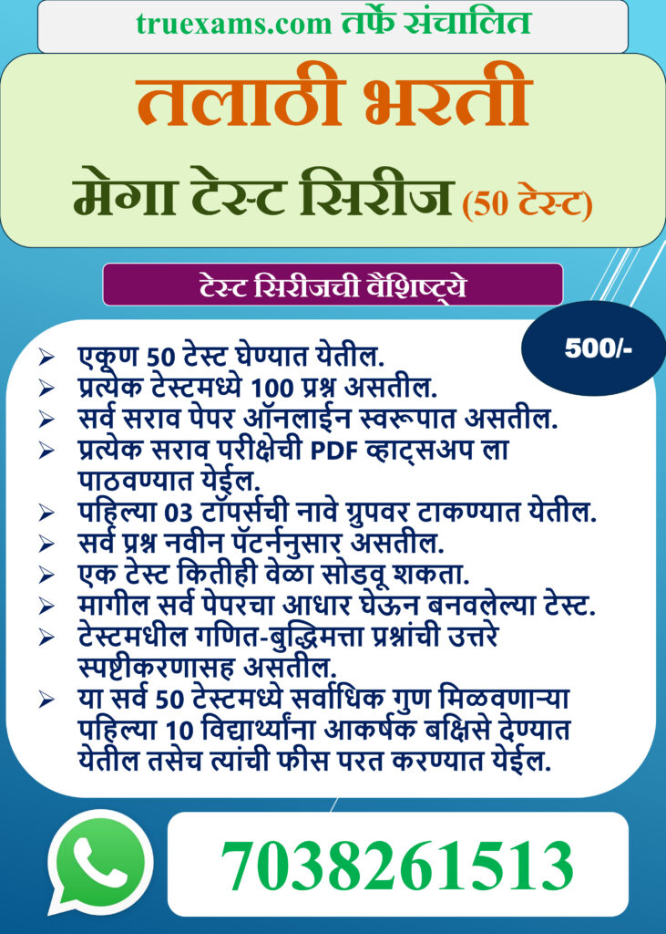 ToggleMPSC, तलाठी भरती, पोलीस भरती तसेच इतर स्पर्धा परीक्षांसाठी चालू घडामोडी महत्वाचा विषय आहे. त्यामुळेच आम्ही तुमच्यासाठी घेऊन आलो आहोत चालू घडामोडी ऑनलाईन सराव परीक्षा. या सराव परीक्षा एकदम फ्री आहेत. तुम्ही आमचे टेलिग्राम चॅनेलही जॉईन करू शकता. सर्व अपडेट टेलिग्राम चॅनलवर टाकण्यात येतात.